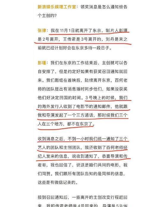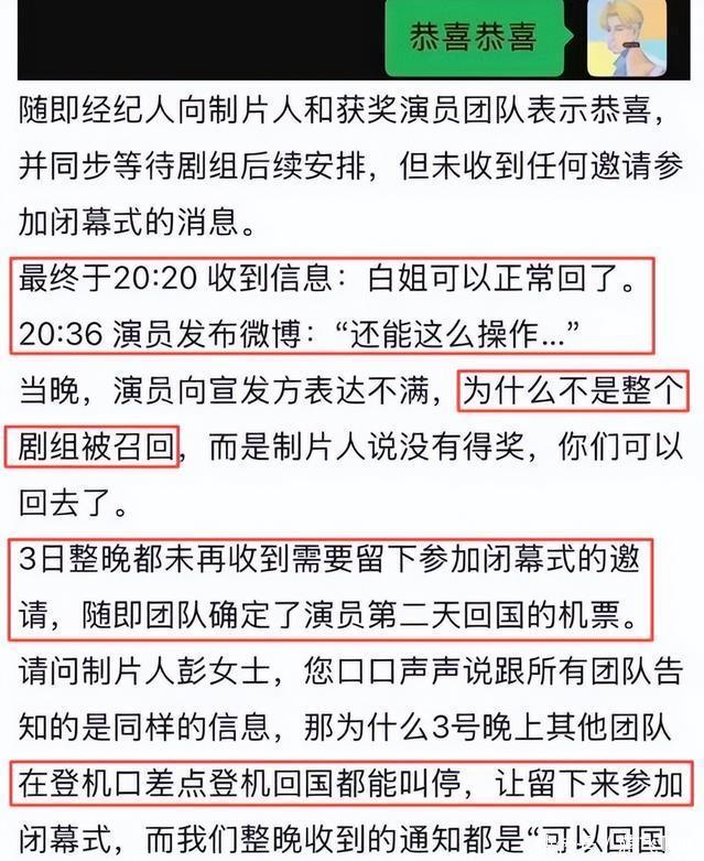 制片人表示,她3日收到领奖通知,和导演开了视频会议后,统一转达获奖通知,没有针对任何人。 告知白百何可以回国,也是剧组出于对她个人行程的尊重,没有奖提前回,也是业内公认的活动规则,可没想到到了白百何这里,变成剧组排挤她。