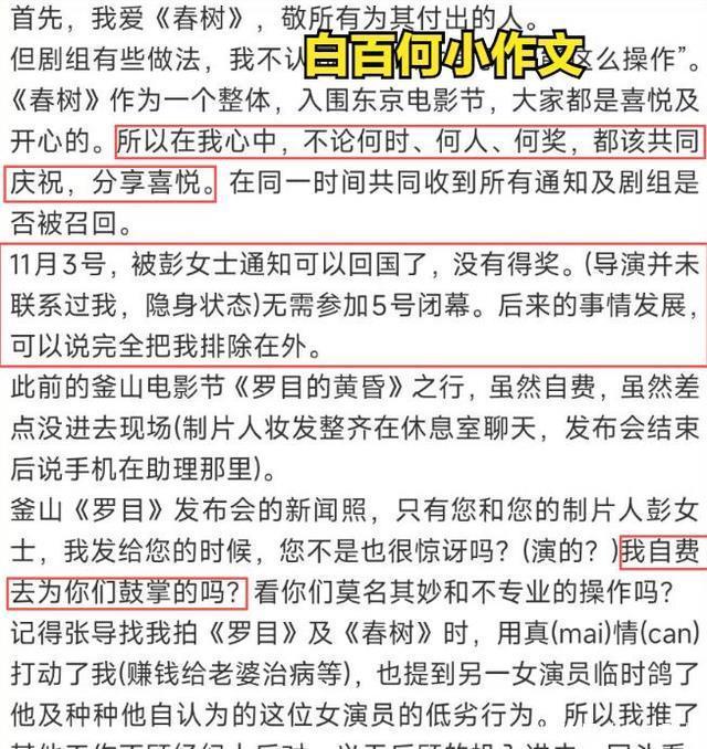 制片人的一番话,逆转舆论走向,也有人发现,白百何自己说话都前后矛盾。 她说釜山电影节,自费去给导演鼓掌,明显是她没获奖不愿意去,可在东京电影节,同样没获奖让她提前回来,她又委屈抱怨不让她参加活动。